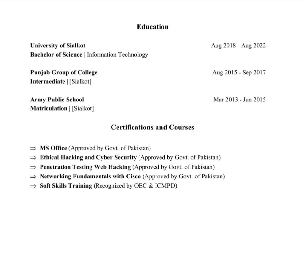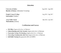 أنا متخصص في تكنولوجيا المعلومات ابحث عن وظيفة في المملكة العربية السعودية تخرجت في مجال تكنولوجيا المعلومات ولدي خبرة ثلاث سنوات عملت سابقا في قسم دعم فني أو مسؤول أنظمة تكنولوجيا المعلومات مبتدئ في شركة كأهة للصناعات. أتطلع الآن الى مواصلة مسيرتي المهنية في المملكة العربية السعودية، وأنا متواجد فيها حاليا ومستعد للانضمام فورا. لدي أيضا أربع شهادات معتمدة من حكومة باكستان (البنجاب) شكر