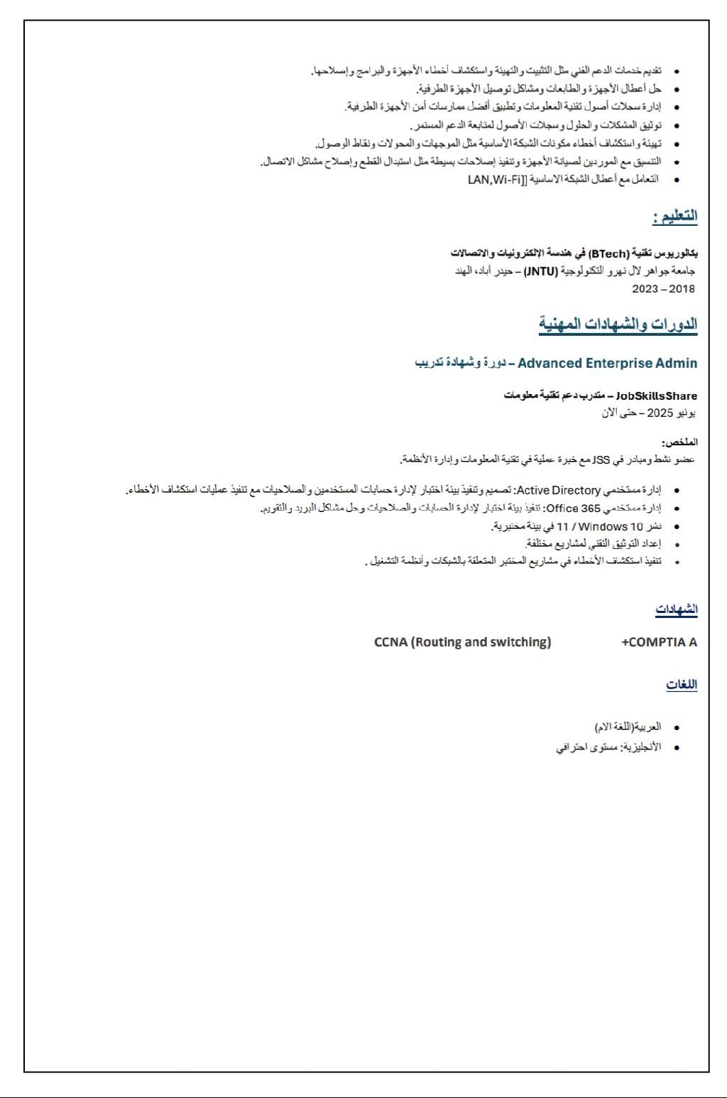 أنا مهندس دعم فني سوداني بخبرة عملية في تقديم الدعم الفني من المستوى الأول والحفاظ على استقرار أنظمة تقنية المعلومات. عملت سابقا في شركة الموفر (جازان - السعودية) حيث قمت بحل مشاكل الاجهزة والبرمجيات، دعم اجهزة الحاسب المكتبية والمحمولة، استكشاف أعطال الشبكات الأساسية (الراوترات، السويتشات، ونقاط الوصول) إدارة سجل الأصول التقنية، وتطبيق أفضل ممارسات أمن الاجهزة الطرفية