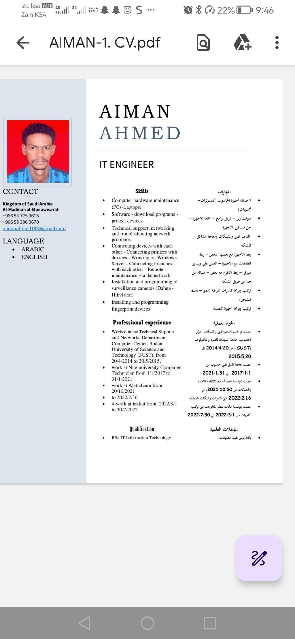الاسم أيمن أحمد الخاتم سليمان / الجنسية سوداني بكالوريوس تقنية معلومات الخبرة عملت بمجمع واسني الطبي it صيانة اجهزة الكميبوتر العمل علي ويندوز سيرفر ربط الطابعات. الدعم الفني الكامل. عملت 3 سنوات في مجال تركيب وبرمجة كاميرات المراقبة والسنترالات. واجهزة الحضور والانصراف. والانتركوم