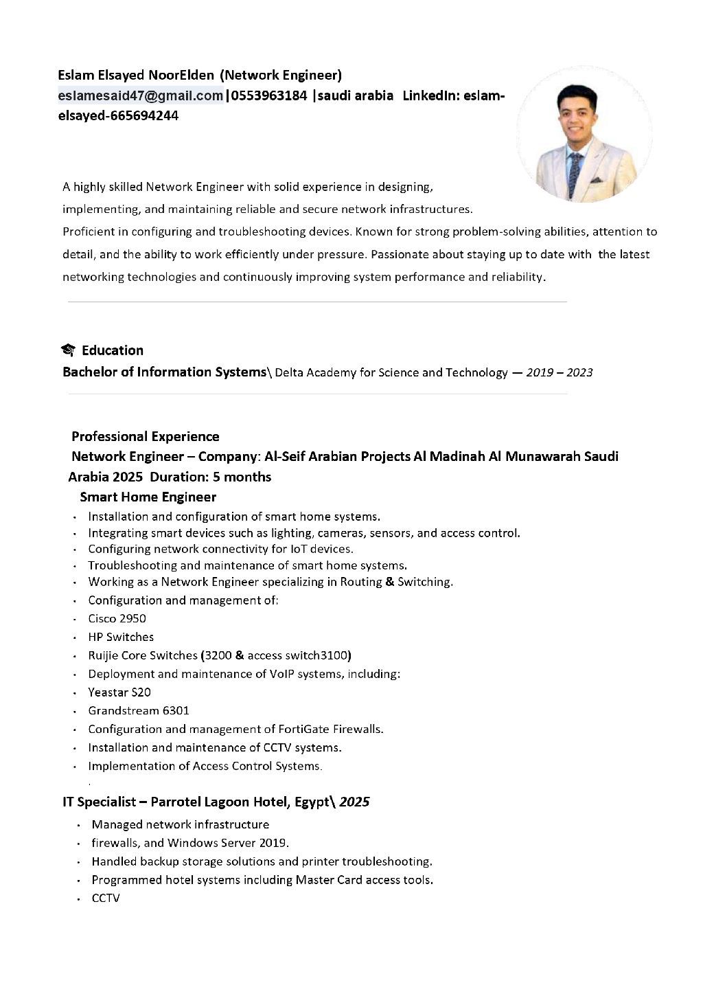 مهندس شبكات محترف خبرة ثلاث سنوات أقدم حلول تقنية متكاملة للشركات والأفراد صيانة كمبيوتر ولابتوب تركيب وضبط الشبكات والسويتشات اعداد الراوترات والفاير وول كاميرات مراقبة CCTV أنظمة VOIP والدعم الفني