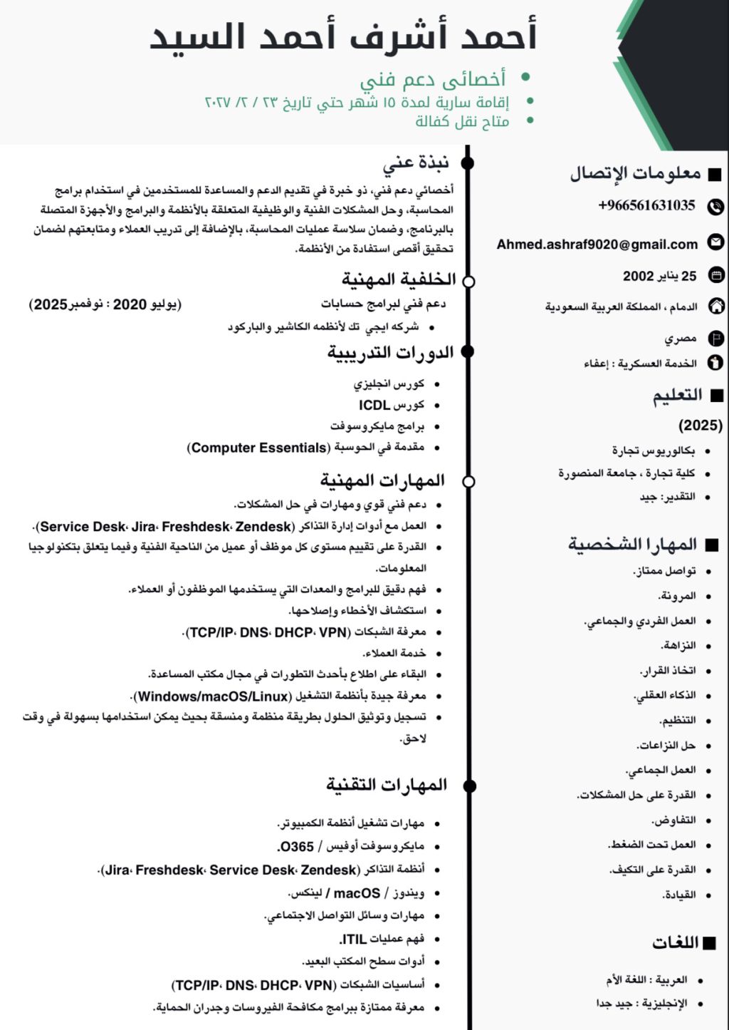 دعم فني لبرامج الحسابات بخبرة 5 سنوات في تشغيل أنظمة المحاسبة، حل المشكلات الفنية، متابعة الأعطال، ودعم المستخدمين بكفاءة. خبرة في تدريب العملاء، ضمان دقة البيانات، والتنسيق مع فرق العمل لتحسين الأداء. امتلك مهارات تواصل قوية، تحليل المشكلات، والعمل تحت الضغط، وأسعى لفرصة عمل مناسبة داخل المملكة العربية السعودية