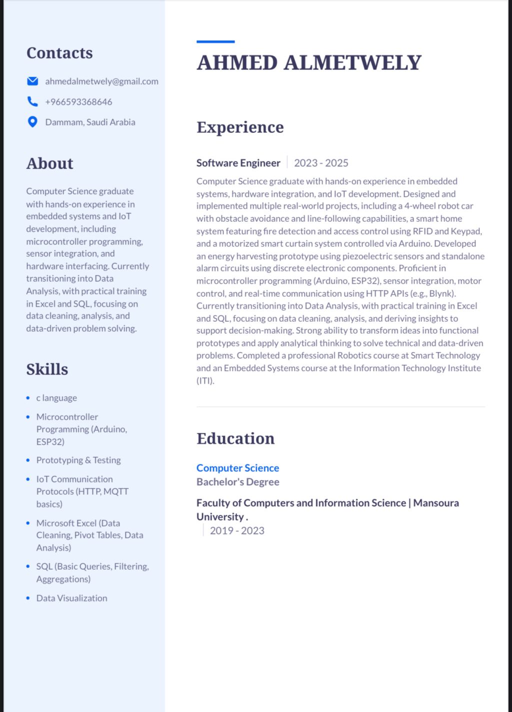 مطلوب فرصة عمل - محلل بيانات بخلفية هندسية. أنا أحمد علاء بكالوريوس علوم حاسب، محلل بيانات اعمل على تحليل البيانات وتنظيفها واستخراج المؤشرات والتقارير لدعم اتخاذ القرار، باستخدام أدوات التحليل واللتي هي excel, sql, power pi الى جانب ذلك امتلك خبرة قوية جدا في مجال الأنظمة المدمجة وال iot وأيضا متخصص في الأردوينوا، حيث قمت بتنفيذ مشاريع عملية تشمل الآتي arduino - esp32 - sensors
