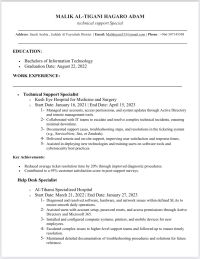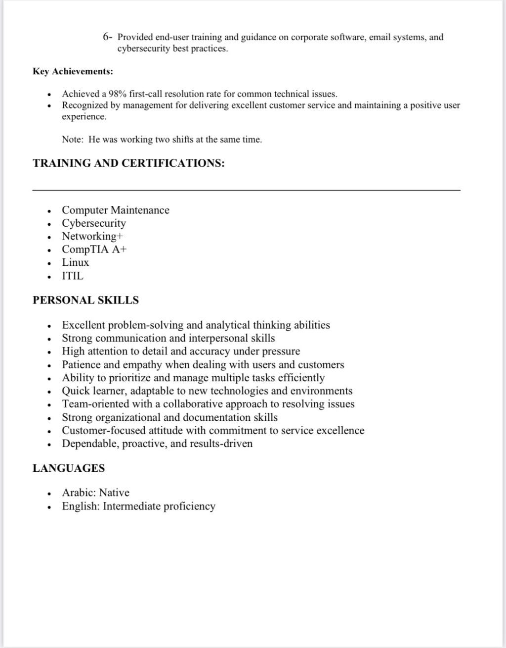 أخصائي تقنية معلومات (IT) حاصل على بكالوريوس في تكنولوجيا المعلومات، ابحث عن فرصة عمل في مجال الدعم الفني أو التشغيل التقني. لدي خبرة عملية في المستشفيات والمراكز الطبية، ومتمكن من المهارات التالية الدعم الفني تشخيص واصلاح أعطال الحواسيب، الطابعات والأنظمة البرمجية. إدارة الأنظمة التعامل الاحترافي مع Active Directory، Microsoft 365، وخدمات البريد أ