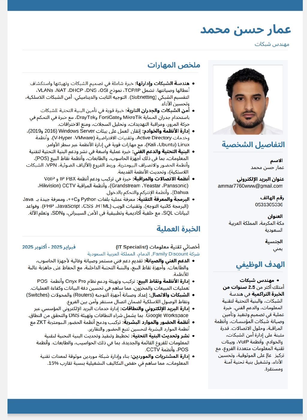 مهندس شبكات امتلك أكثر من 2.5 سنوات من الخبرة التراكمية في هندسة الشبكات والبنية التحتية لتقنية المعلومات، والدعم الفني خبرة عملية في تصميم وتنفيذ وتأمين وصيانة شبكات المؤسسات، وأنظمة المراقبة وحلول الاتصالات. قدرة مثبتة على إدارة أمن الشبكات والخوادم، وأنظمة VoIP، وبيئات تقنية المعلومات متعددة الفروع، مع تركيز عال على الموثوقية، وتحسين الأداء، وتشغيل بنية تحتية آمنة ومستقرة