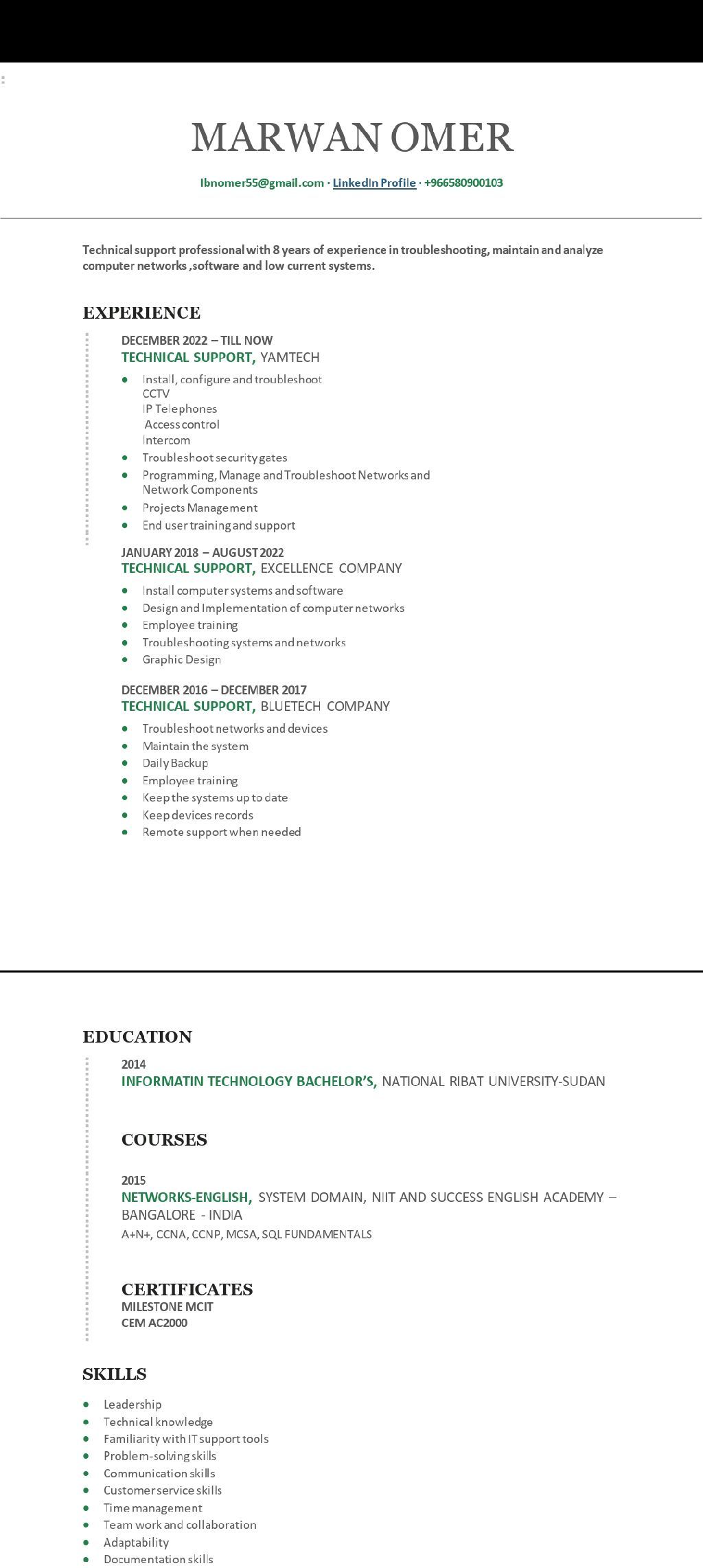 سوداني باحث عن وظيفة في مجال تقنية المعلومات (IT) بخبرة أكثر من 8 سنوات في الشبكات، السيرفرات، كاميرات المراقبة، أنظمة Access Control، الكمبيوترات والطابعات. خبرة قوية في التركيب، الصيانة، وحل الأعطال، لدي رخصة قيادة وإقامة قابلة للنقل
