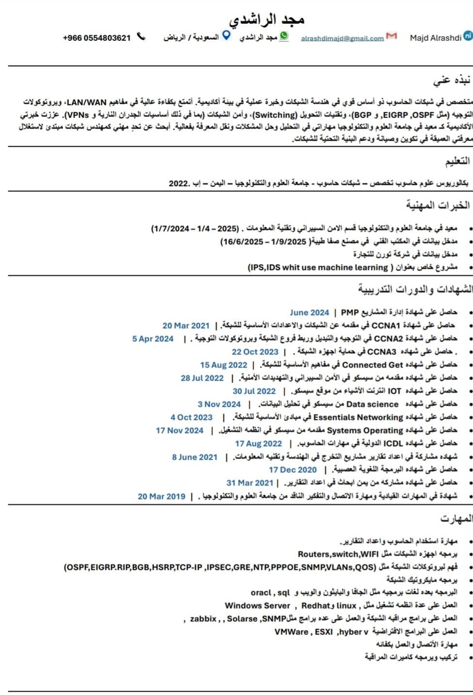 ابحث عن فرصة عمل في مجال شبكات الحاسوب وتقنية المعلومات. لدي معرفة جيدة في اعداد وتركيب الشبكات السلكية واللاسلكية اعداد اجهزة الراوتر والسويتشات استكشاف مشاكل الشبكات وحلها دعم المستخدمين الفني وصيانة الاجهزة أتميز بالالتزام، سرعة التعلم، والحرص على تطوير المهارات التقنية بشكل مستمر