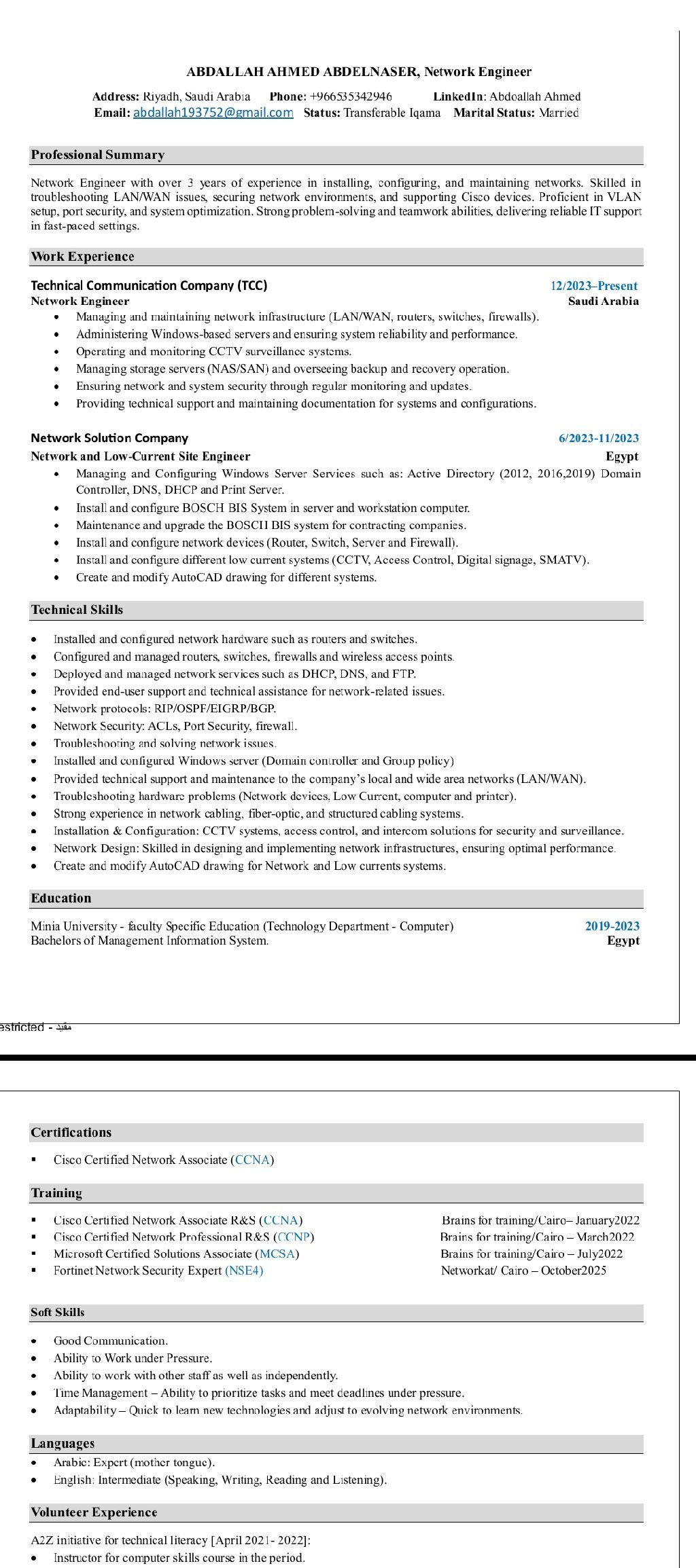 مهندس شبكات خبرة 3 سنوات في تصميم وصيانة الشبكات المحليه Fortigate Firwall & CCNA & CCNP R S MCSA & NSE4 علي دراية جيده بأنظمة Voip Avaya and wireless arouba وأنظمة مراقبه NMS Systems Zabbix and الشبكات Solar winds