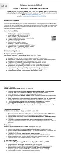 محمد أحمد مهندس تقنية معلومات IT خبرة 6 سنوات في إدارة وتشغيل السيرفرات والشبكات والبنية التحتية لتقنية المعلومات، وتركيب الشبكات والأنظمة الأمنية، المؤهلات والخبرات إدارة وصيانة شبكات LAN وWAN تركيب واعداد اجهزة الكمبيوتر، الطابعات، وأنظمة البيانات الاحتياطية وادارة مشاريع التقنية