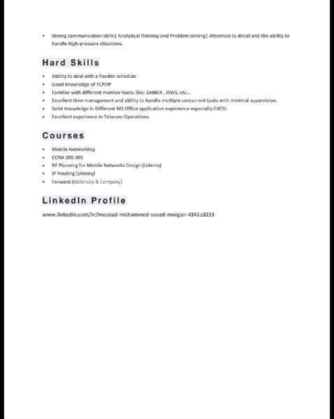 مهندس اتصالات سوداني الجنسية بخبرة تزيد عن ثلاثة سنوات في مجال أل IT والاتصالات، عملت في تشغيل وصيانة الشبكات، الهندسة اللاسلكية، وحاليا كمهندس NOC. اكتسبت خبرة قوية في مراقبة الشبكات، تحليل الأعطال، وضمان استمرارية الخدمة. لدي شغف بمجال الشبكات ومراقبة الأنظمة ومستعد لأي فرصة في القريب العاجل