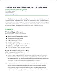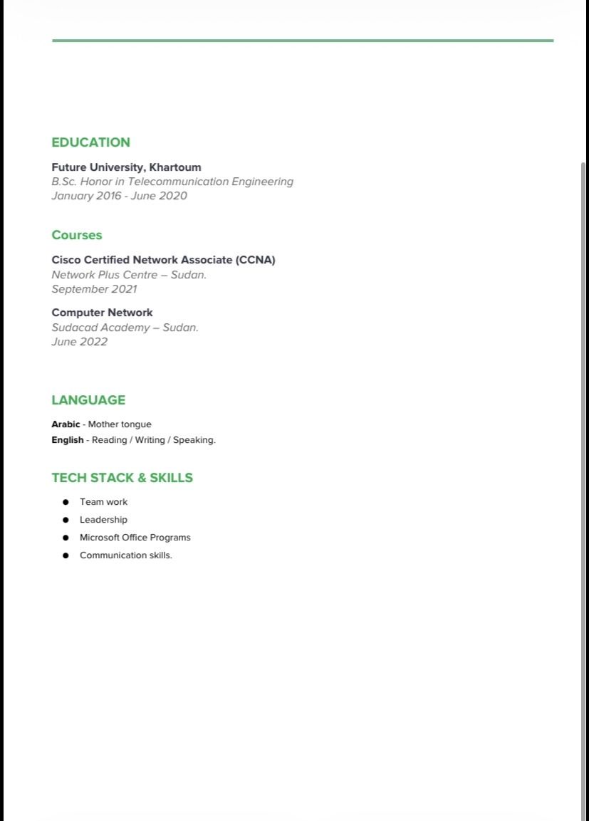 مهندس اتصالات سوداني. خبرة عام في الدعم الفني جيد جدا في اللغة الانجليزية متواجد إقامة سارية ورخصة سارية