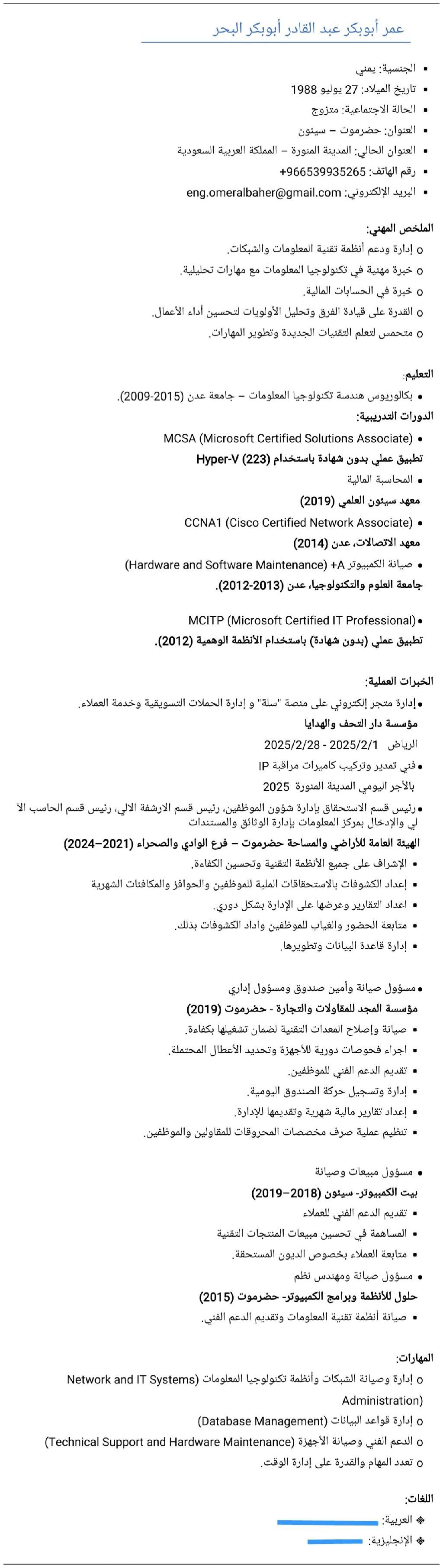 مهندس تكنولوجيا معلومات (IT) اسمي عمر أبو بكر من اليمن، حضرموت سيئون بكالوريوس هندسة IT وخبرة في إدارة الأنظمة والشبكات، الدعم الفني وصيانة اجهزة الحاسب. متمكن في الأرشفة الالكترونية، ادخال البيانات وإدارة قواعد البيانات. وعملت في عدة مجالات الاشراف الاداري، الموارد البشرية والاستحقاقات، اضافة الى تركيب وتمديد كاميرات مراقبة IP