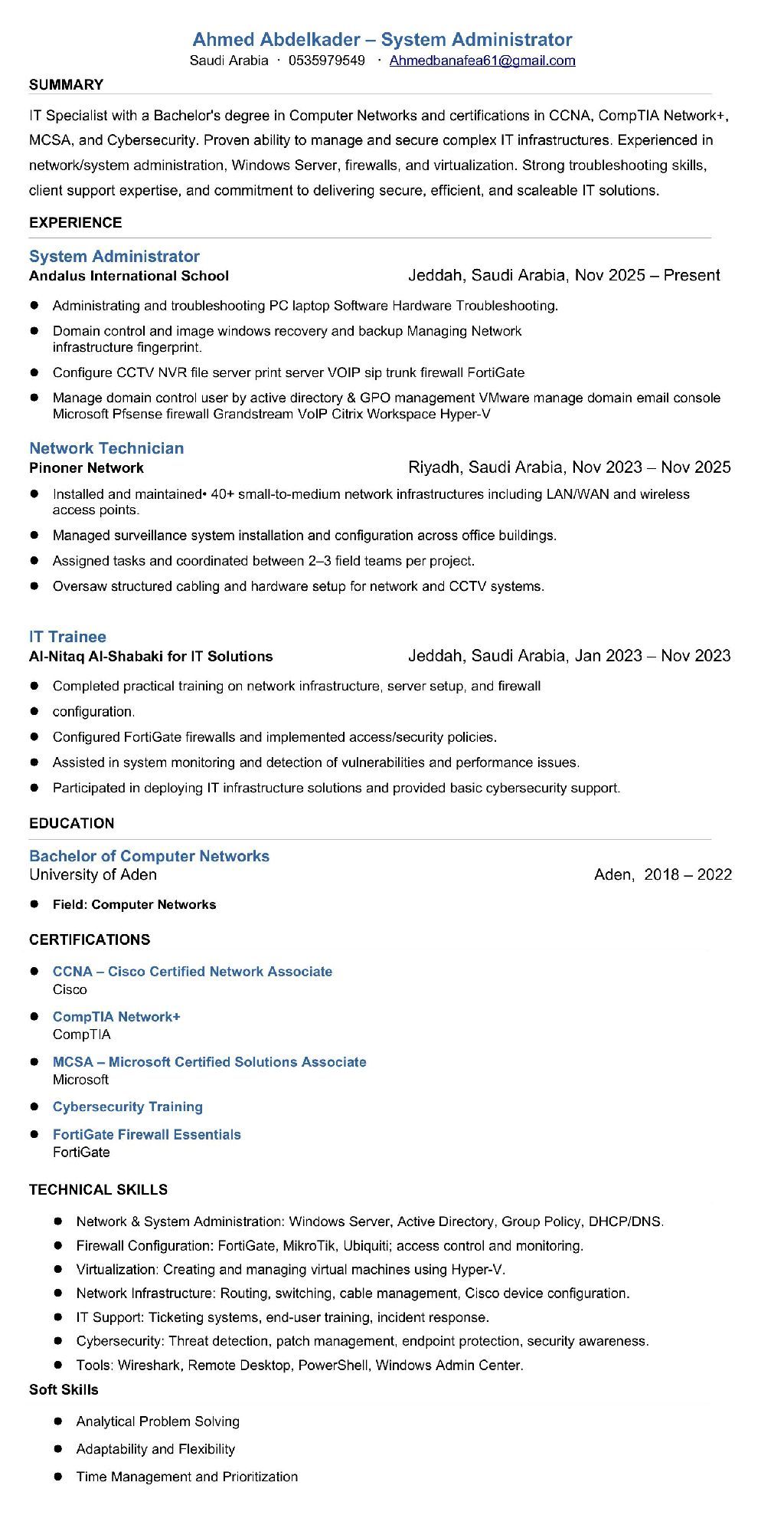 ابحث عن فرصة للعمل في شركة بوظيفة IT support تثبيت أنظمة التشغيل وعمل نسخ للسيرفر والبيانات وحل مشاكل الاجهزة والطابعات أو system Administrator إدارة سيرفرات وفايرول وأنظمة البصمة أنظمة الكاميرات شركة أو أي مؤسسة تجارية هذه سيرتي الذاتية