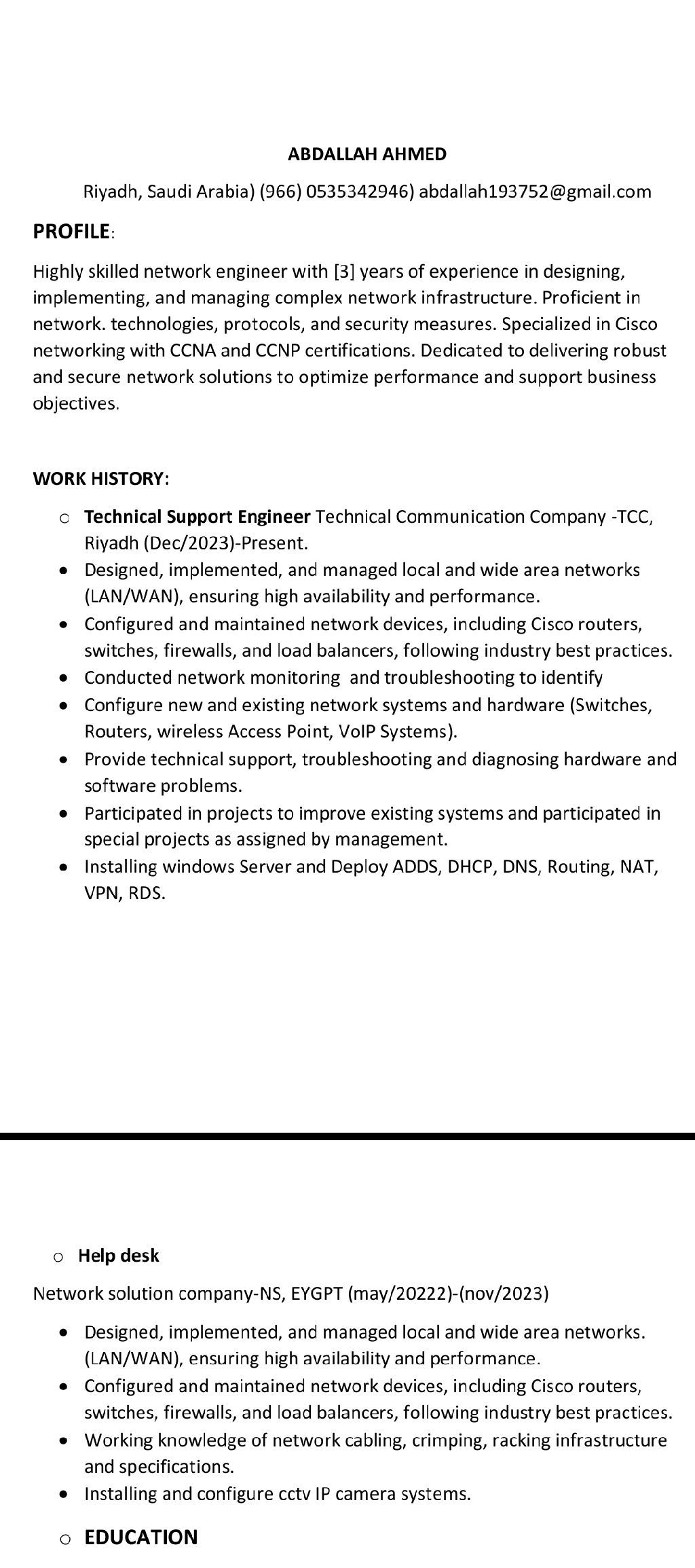 مهندس شبكات خبرة 3 سنوات في تصميم وادارة الشبكات المحليه. دارس ccna & ccnp R S وfirwall fortigate "NSE4" علي دراية بأنظمة "voip" avaya وarouba wireless AP وادارة الشبكة من خلال أنظمة المرقبه "NMS" zabbix, solar