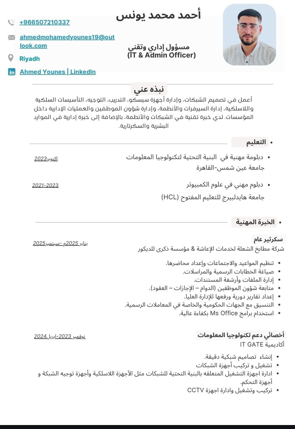 ابحث عن فرصة عمل في مجال الدعم الفني وتقنية المعلومات أو الإدارة، لدي خبرة في تصميم الشبكات، وتركيب الاجهزة، وإدارة أنظمة التشغيل، والدعم الفني للمستخدمين. كما امتلك خبرة ادارية وسكرتارية. ابحث عن بيئة عمل احترافية أطور فيها مهاراتي وأسهم في نجاح المؤسسة