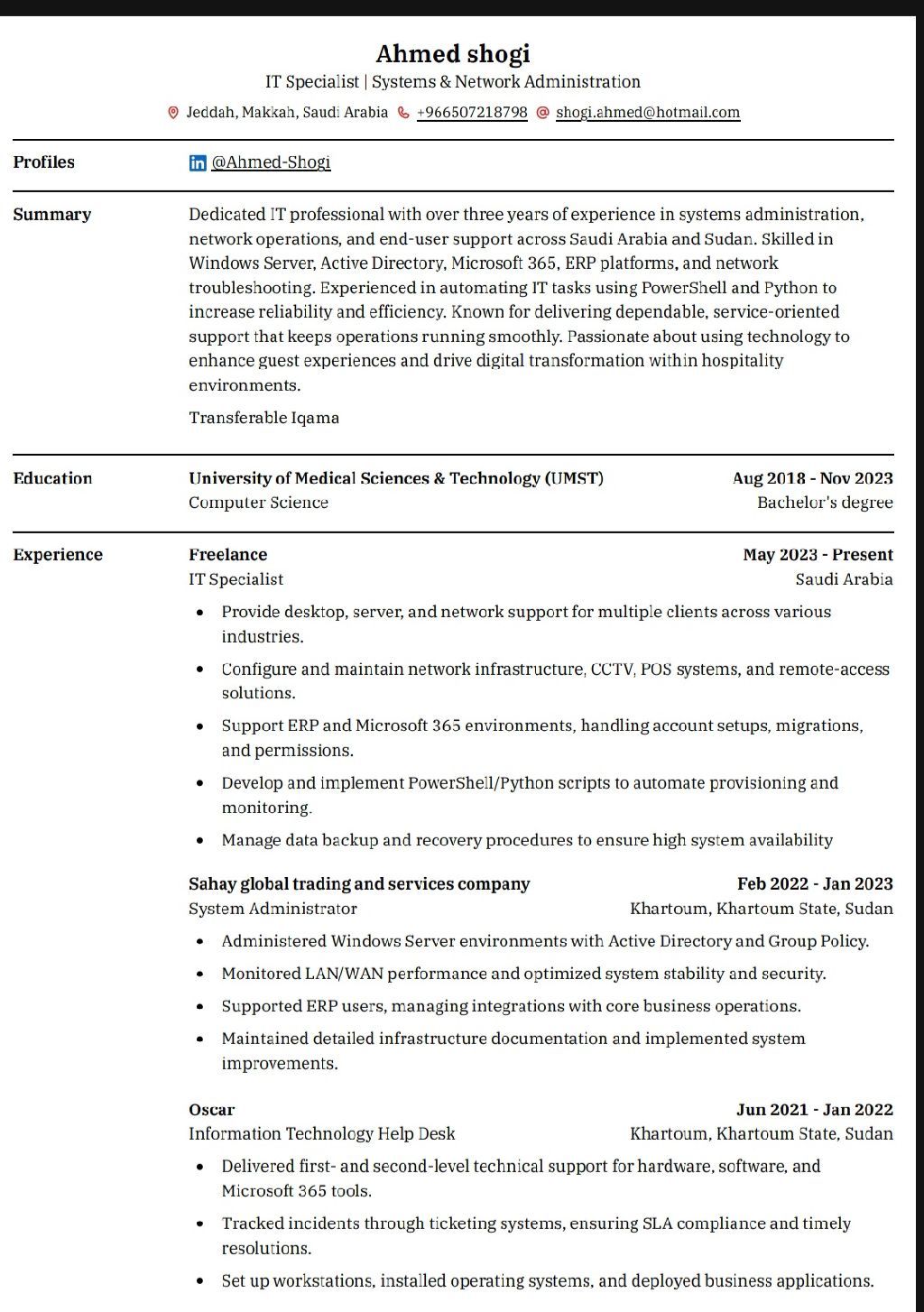 IT Engineer. Ahmed Shogi, based in Jeddah with a transferable Iqama. looking for a role in IT support, System Administration, or Cybersecurity. 2 years of experience (System Admin & Help Desk) Skilled in Office 365, Active Directory, Windows/ Linux Hands - on with SIEM tools. Certified Google IT support, Google Cybersecurity, SOC 101 Fluent in English & Arabic