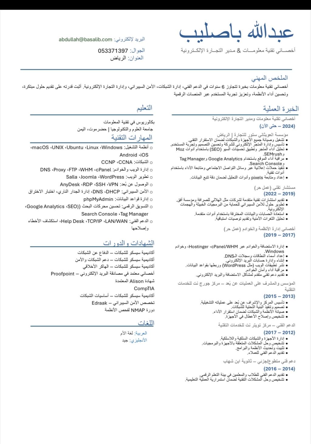 أنا مهندس يمني (حضرمي) حاصل على بكالوريوس تقنية المعلومات لدي أكثر من 6 سنوات خبرة في مجالات الدعم الفني، إدارة الشبكات، وإدارة الأنظمة، بالاضافة الى خبرة في تشغيل المواقع والمتاجر الالكترونية وتحسين أدائها. أتمتع بقدرة عالية على حل المشكلات التقنية وتحسين أداء الأنظمة والشبكات وضمان استقرارها الأمني والتقني