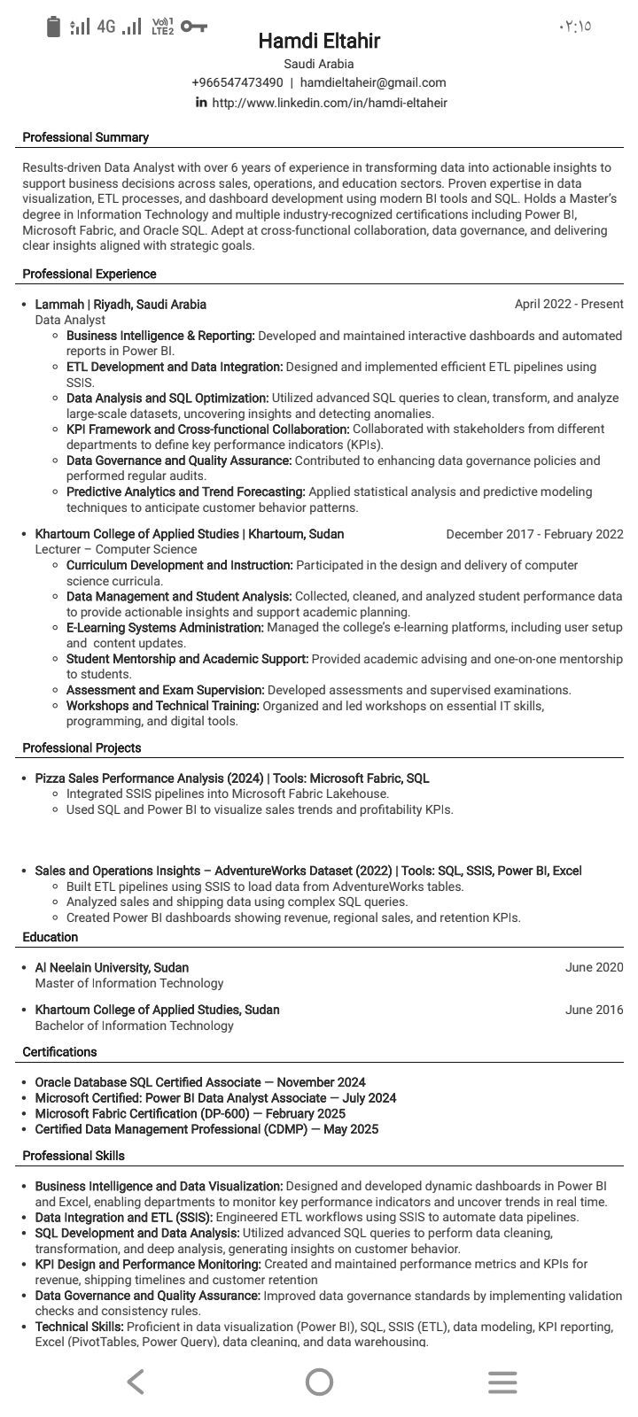 محلل بيانات متواجد في الرياض سنوات الخبرة داخل السعودية 4 سنة أحمل شهادات Microsoft power bi وOracle associate sql وMicrosoft fabric وCDMB إقامة سارية قابلة للتحويل