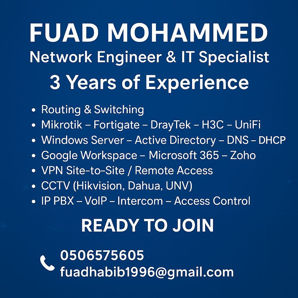 فؤاد محمد، مهندس شبكات وتقني IT خبرة 3 سنوات. أدور على دوام كامل أو جزئي في الرياض. عندي خبرة في تجهيز الشبكات والسيرفرات Fortigate - MikroTik - DrayTek - UniFi PBX - VoIP - CCTV دعم فني وصيانة اجهزة وPOS VPN وربط الفروع Microsoft 365 وGoogle Workspace شغلي مرتب ودقيق، وأتحمل ضغط العمل. للي حاب يتواصل