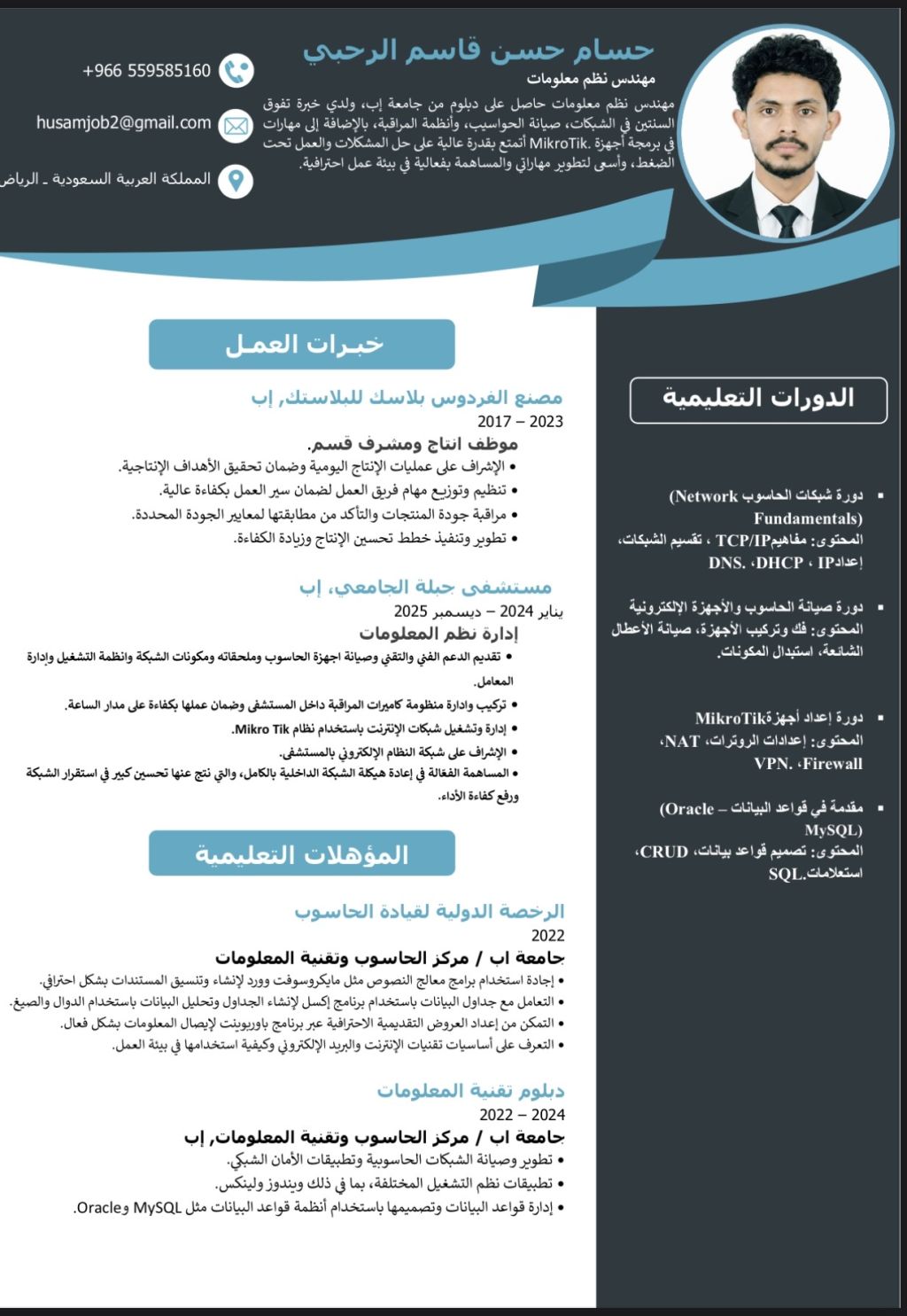 مهندس نظم معلومات (خبرة 8 سنوات) ابحث عن وظيفة في الشبكات والدعم الفني داخل المملكة. شبكات متقدمة خبير في برمجة وإدارة MikroTik وCisco. دعم فني حل سريع ل Troubleshooting) IT والاجهزة والبرامج. أنظمة المراقبة متمكن في تركيب وبرمجة كاميرات IP والتحكم بالدخول. مستعد لبدء العمل فورا في بيئة احترافية