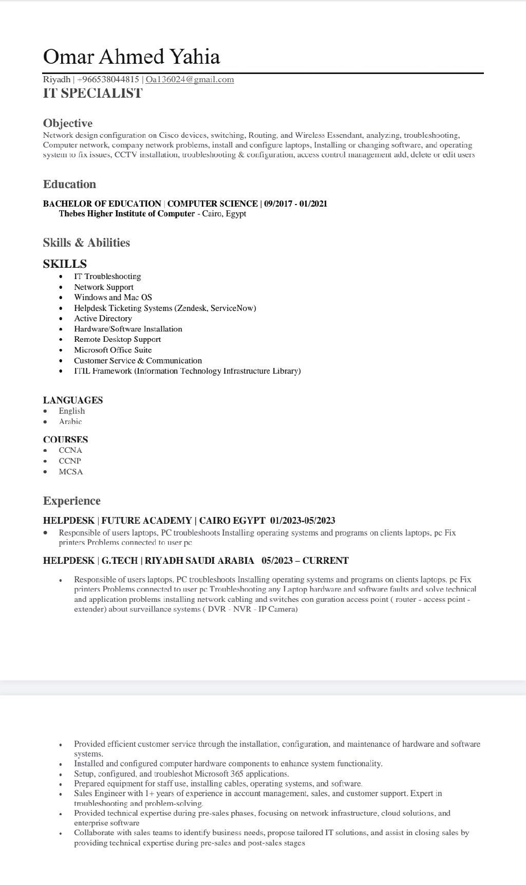 My name is Eng. Omar Ahmed Yahia, and I am currently seeking a new opportunity in the field of IT support and helpdesk. I have experience in IT infrastructure, networking, and technical support, and I am confident that my skills can contribute positively to your organization. I would be grateful if you could consider my CV for any suitable positions. Please find my resume attached for your review