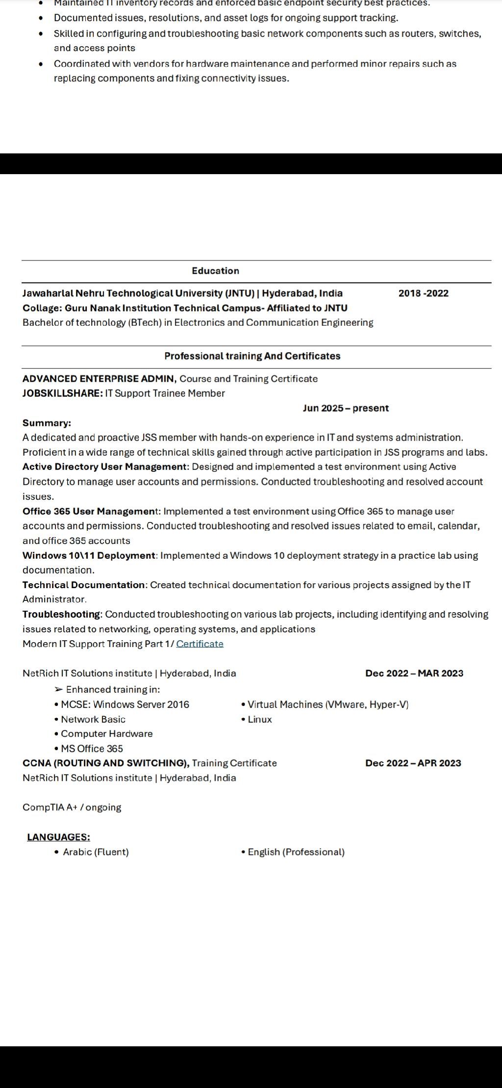 I am an IT support Engineer with hands - on experience delivering first - line technical support and maintaining reliable IT operations. Previously, I worked at Almawfer (Jazan, Saudi Arabia) where I resolved hardware and software issues, supported desktops and laptops, troubleshot basic networking (routers, switches, access points) maintained IT inventory, and CCTV experience