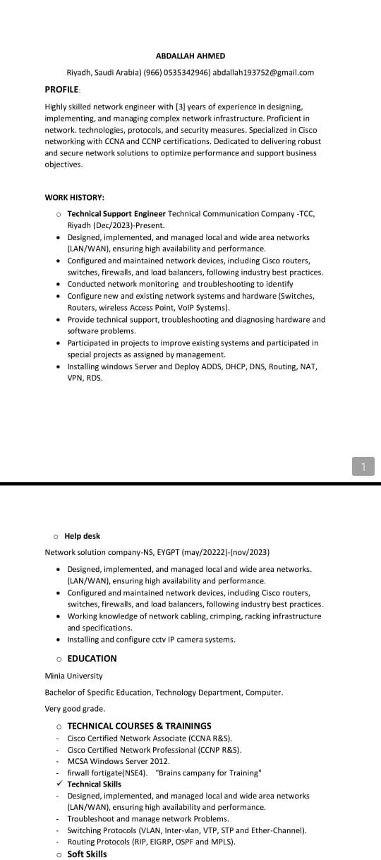 Network Engineer with 3 years of experience in designing and maintaining local area networks (LANs) Certified and trained in CCNA & CCNP ( R S FortiGate Firewall (NSE4) and MCSA. Strong knowledge of VoIP systems (Avaya) wireless networks (Aruba) and network monitoring systems (NMS) such as Zabbix and SolarWinds