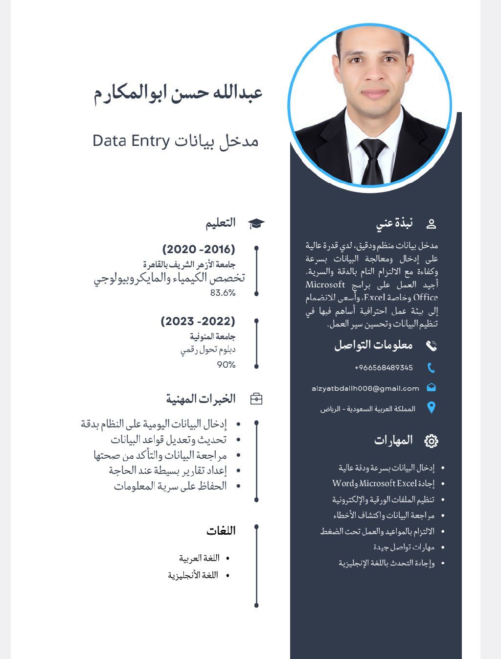مدخل بيانات وصاحب قدرة على استخدام برامج مايكروسوفت والالتزام والتطوير والتحسين المستمر، والقدرة على التحدث بلغتين العربية والانجليزية