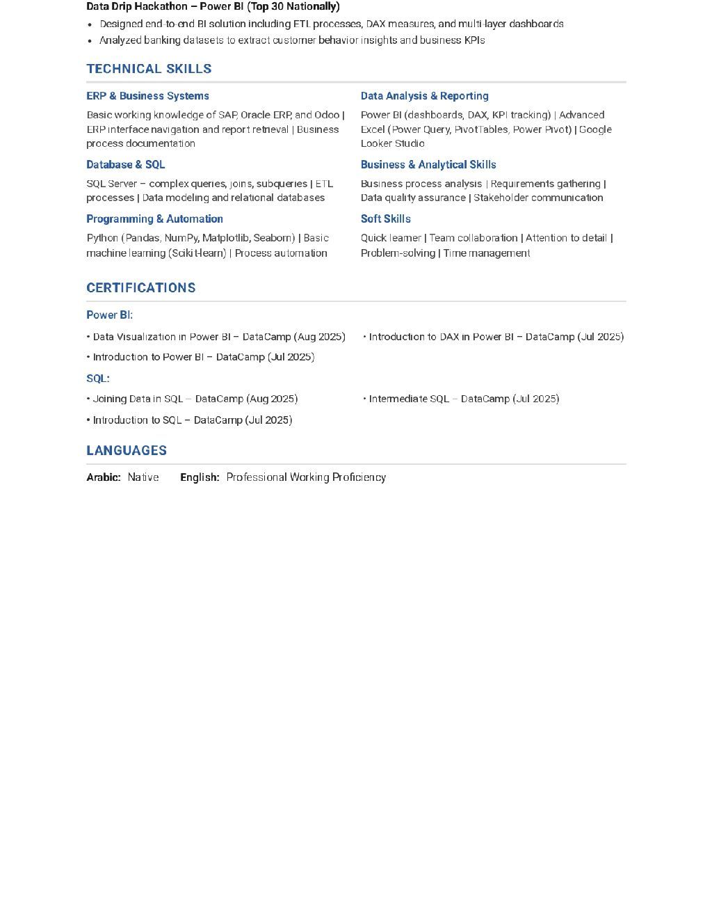 Electronics and Communication Engineering graduate with entry - level experience in ERP systems. Familiar with SAP, Oracle ERP, and Odoo, with skills in business process documentation, reporting, and data analysis using Excel, SQL, and Power BI. Worked as a Data Analyst Intern supporting business requirements and system - related tasks. Seeking a Junior ERP Assistant or ERP Specialist role