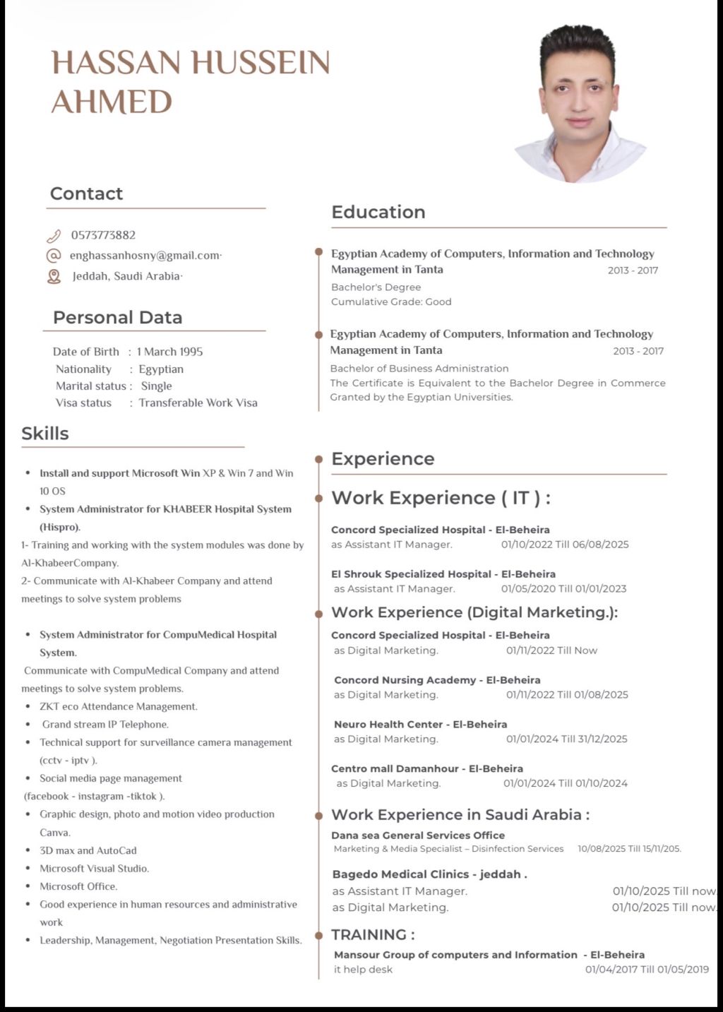 ابحث عن عمل في شركة أو مؤسسة في قسم الحاسب الآلي وتقنية المعلومات حيث انني خبرة 7 سنوات في صيانة الحاسب الآلي وأعمال الشبكات والدعم الفني والتدريب لبرامج التشغيل الحسابات والمستشفيات وأيضا كاميرات المراقبه وسنترال جراند ستريم وخبرة بالسوشيال ميديا والاعلانات وادارة الحسابات الالكترونية في المجال الطبي ومجالات أخرى متواجد في جدة إقامة قابلة للنقل