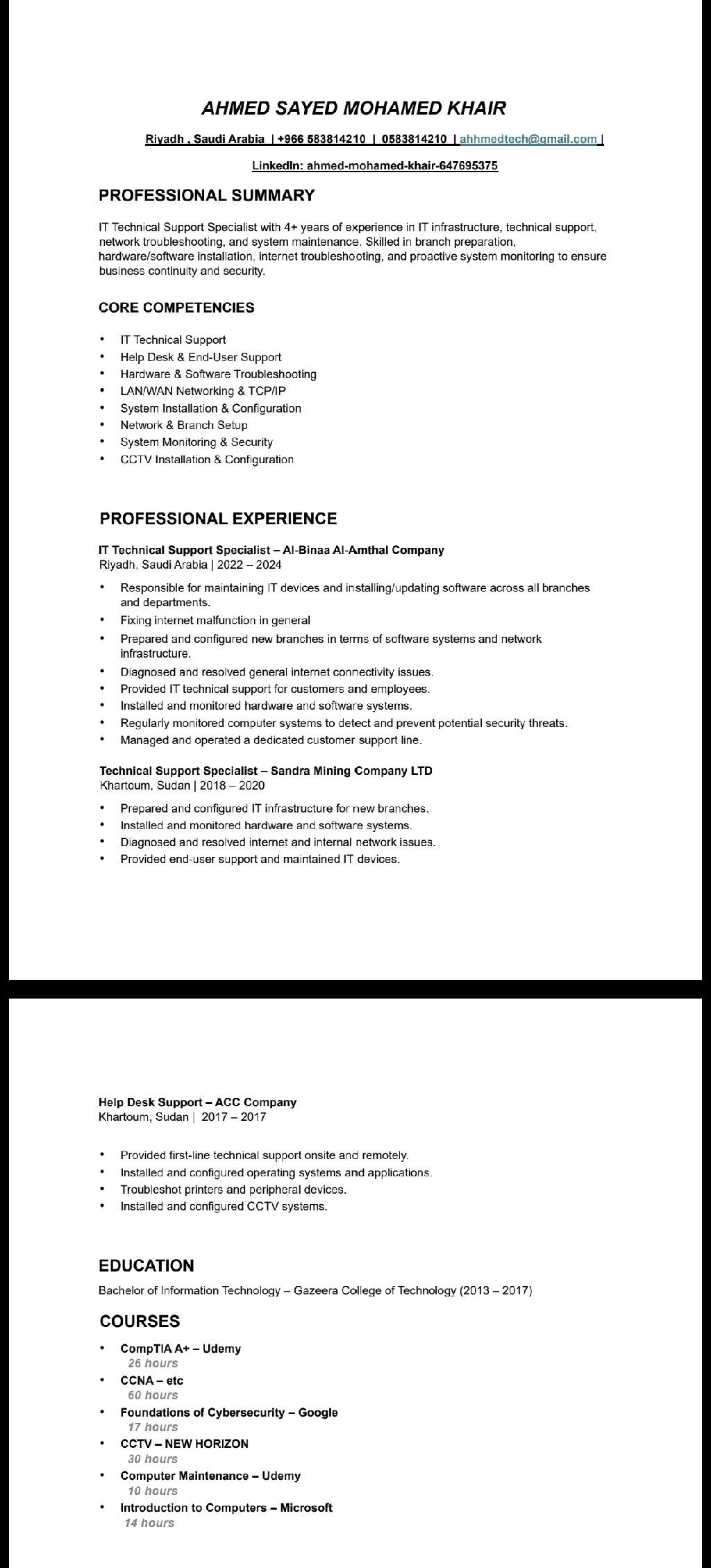 IT support Specialist 4 + Years Experience Infrastructure & End - User Support Results - driven IT support Specialist with over 4 years of hands - on experience in IT operations and technical support. Proven ability to prepare and configure IT infrastructure for new branches, maintain hardware and software systems, and resolve complex network and connectivity issues