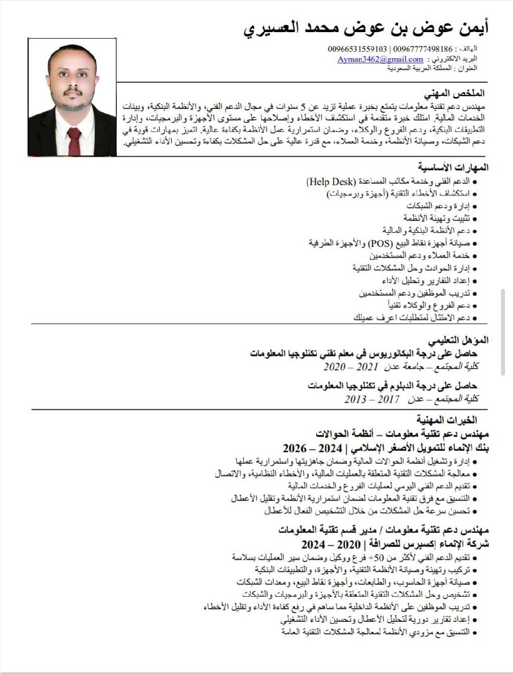 مهندس دعم تقنية معلومات تمتع بخبرة عملية تزيد عن 5 سنوات في مجال الدعم الفني، والأنظمة البنكية، وبيئات الخدمات المالية. امتلك خبرة متقدمة في استكشاف الأخطاء وإصلاحها على مستوى الاجهزة والبرمجيات، وإدارة التطبيقات البنكية، ودعم الفروع والوكلاء، وضمان استمرا رية عمل الأنظمة بكفاءة عالىة. أتميز بمهارات قوىة في دعم الشبكات، وصيانة الأنظمة، وخدمة العملاء، مع قدرة عالىة على حل المشكلات بكفاءة
