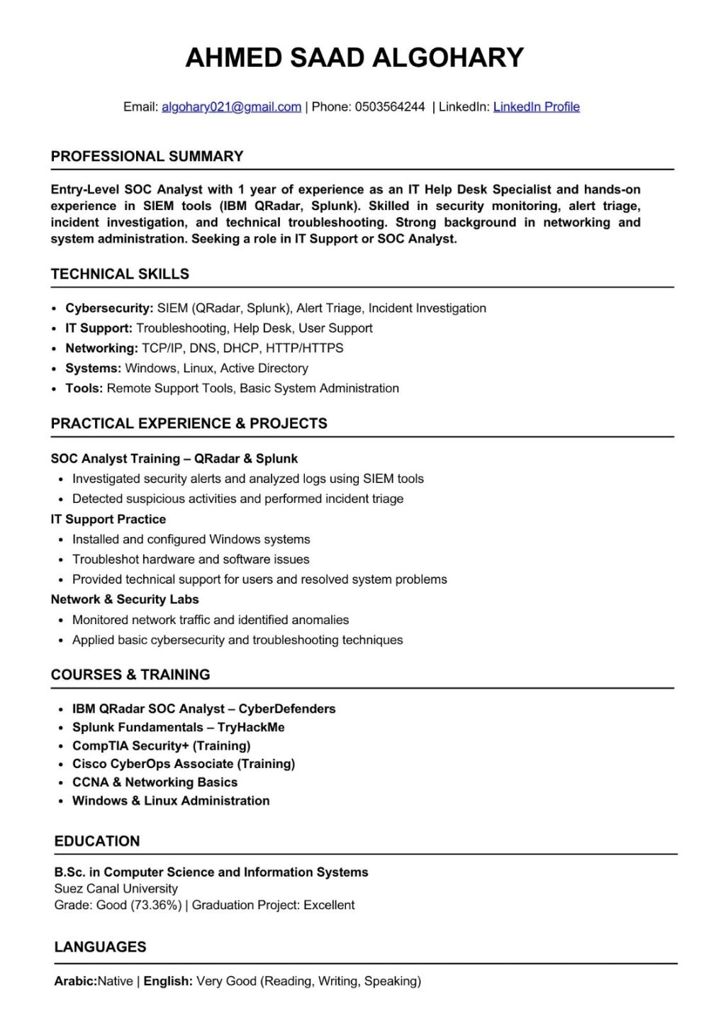 I have 1 year of experience in IT Help Desk & Technical Support, seeking opportunities in IT support/ Help Desk Technical Support Entry - Level Cybersecurity My experience includes Troubleshooting hardware & software issues Networking fundamentals (TCP/ IP, DNS, HTTP/ HTTPS) Linux & Windows environments SIEM tools (IBM QRadar & Splunk) Log analysis, alert handling & basic threat detection Available