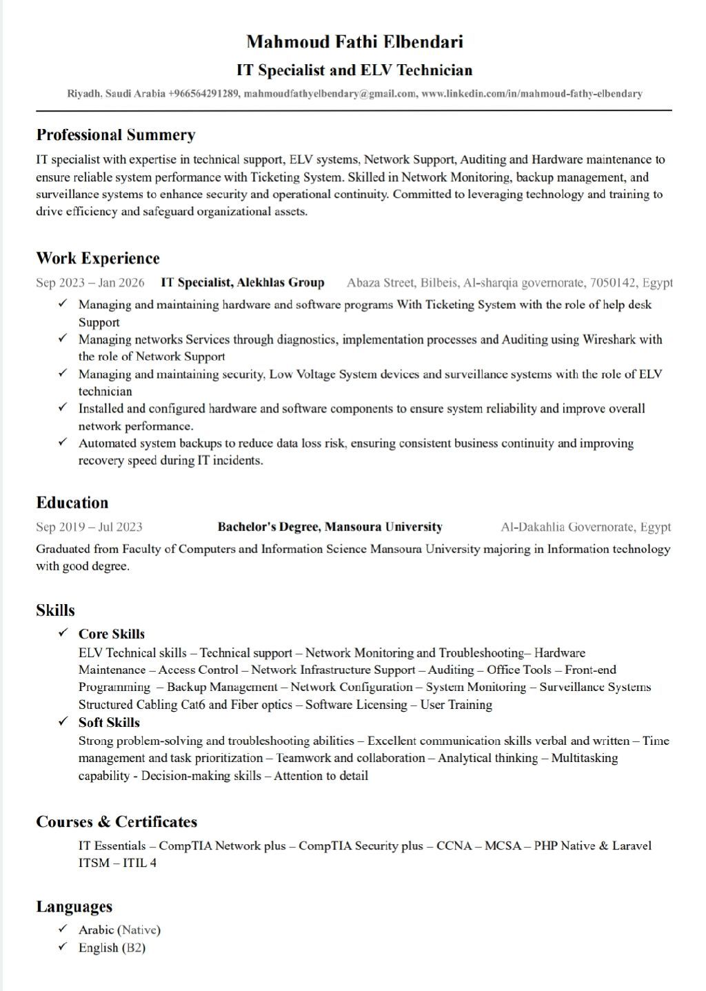 IT specialist with expertise in technical support, ELV systems, Network Support, Auditing and Hardware maintenance to ensure reliable system performance with Ticketing System. Skilled in Network Monitoring, backup management and surveillance systems to enhance security and operational continuity. Committed to leveraging technology and training to drive efficiency and safeguard organizationa