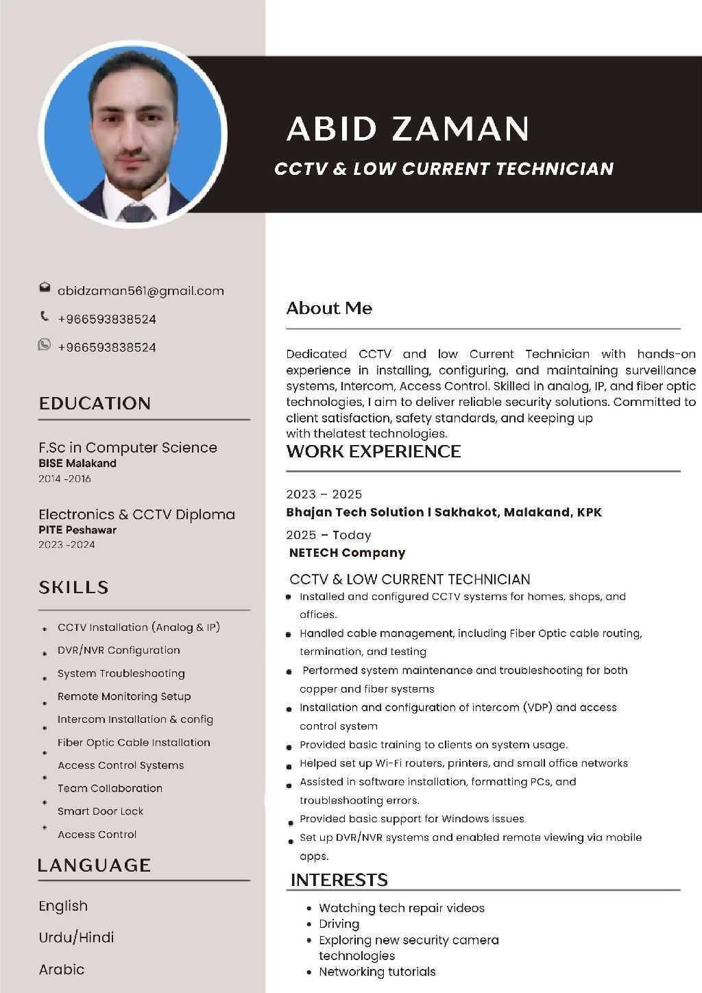 My name is Abid zaman, and I am an experienced Access control, Smart Door lock, CCTV & Intercom Technician with strong skills in installation, maintenance, and technical support. I have worked with various security systems including DVRs, NVRs, IP cameras, analog systems, Optical Fiber splicing and testing, Smart Door Lock, ip phone and intercom complete setups. I am confident in handling wiring