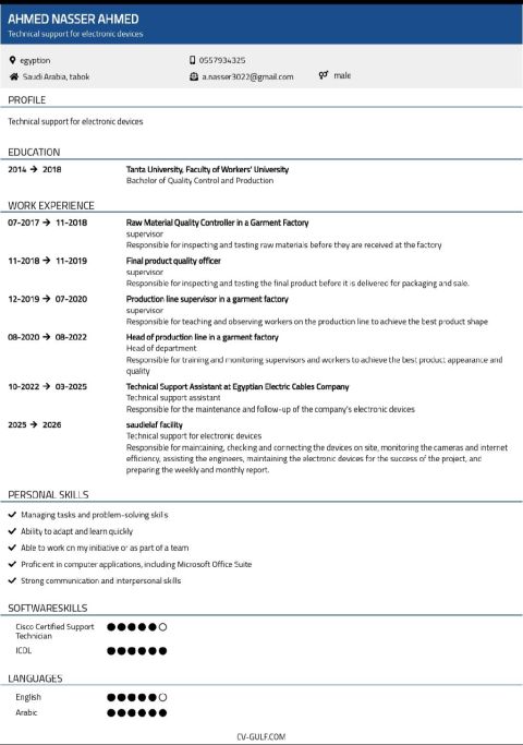 ابحث عن فرصة عمل في مجال الدعم الفني / تقنية المعلومات. أنا خريج بكراليوس في تقنية معلومات اكتسبت خبرة عملية في الشركة الصينية في البترول - صيانة اجهزة الحاسب الآلي - أنظمة التشغيل وإدارة البرامج - خدمة العملاء وحل المشكلات التقنية - فر متة الاجهزة وتثبيت الأنظمة - تعريف الطابعات واعدادها على الشبكة أتطلع الى الانضمام الى جهة أساهم فيها بخبرتي ومهاراتي، مع الاستمرار في تطوير نفسي مهنيا