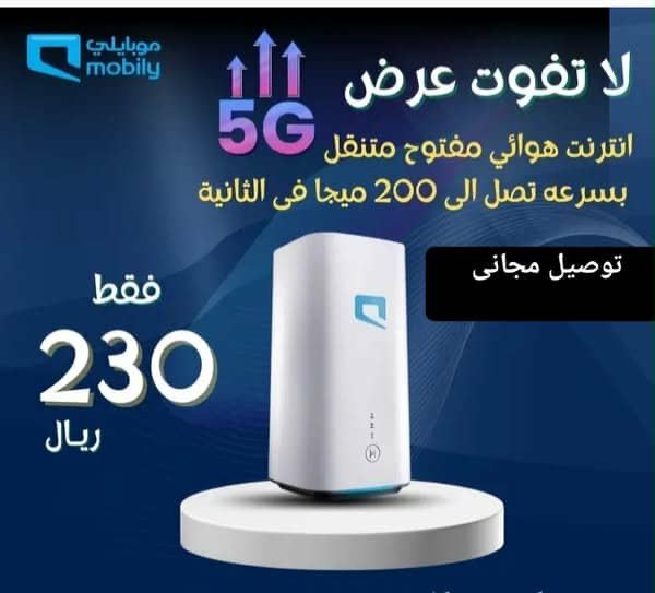 انترنت موبيلي 5g لا محدود وبدون سياسة الاستخدام العادل وبسعر 230 ريال شهريا شامل الضريبة دفعه مقدمه 200 ريال مستردة فاتورة الشهر الرابع