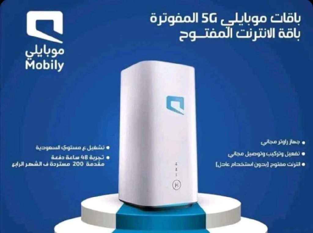 عروض موبايلي 5G الجديدة - انترنت بلا حدود لو تبي سرعة ثابتة، تحميل بلا توقف، وتشغيل كل أجهزتك بدون تقطيع باقة موبايلي سرعة 100 ميجا شريحة انترنت لا محدود بدون استخدام عادل راوتر موبايلي 5G - أحدث اصدار تغطية قوية تصل لأكثر من 25 متر تشغيل أكثر من 20 جهاز بنفس الوقت عقد سنة ونصف السعر الشهري 230 ريال فقط تأمين 200 ريال (مسترد في الشهر الرابع بعد التفعيل)