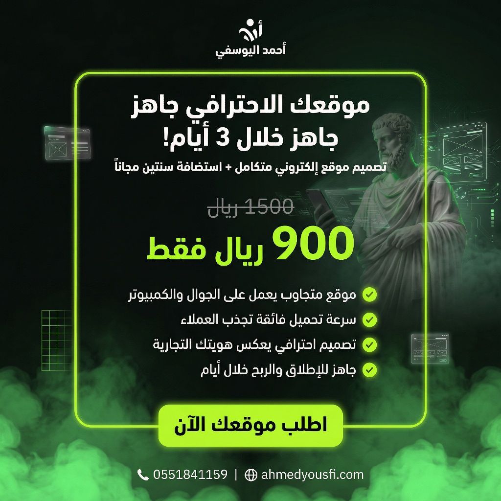 موقعك الاحترافي خلال 3 أيام تصميم موقع الكتروني متكامل + استضافة سنتين + دومين. com 900 ريال فقط موقع سريع، متجاوب، وجاهز للعمل مباشرة. ahmedyousfi. com