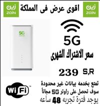 راوتر زين 5G - انترنت لا محدود مع راوتر وشريحة مجانا وتجربة لمدة يومين واذا لم تناسبك الخدمة، يمكنك اعادة الراوتر لدى فرع زين سعر الاشتراك الشهري 239 ريال فقط مع الضريبة التوصيل والتركيب مجاني