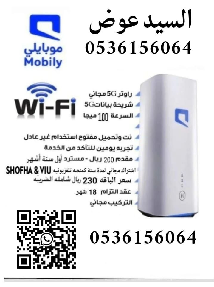 عرض موبايلي نت مفتوح لا محدود اشتراك شهري 230 ريال راوتر 5G دفعه مقدمه مع التفعيل 200 ريال الجهاز والشريحة مجاني المقدم مسترد الشهر الرابع