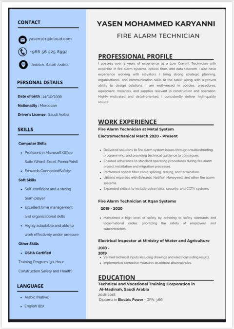 فني انذار حريق خبرة 5 سنوات وعلى رأس عمل اشراف على تيم ونجاز تركيب صيانة وتم تسليم مشاريع ضخمه وتسلمها وفق معايير الدفاع المدني ولدي خلفية في برمجة لوحة ادورد وعملت على لوح البرمجة اغلبها وخبرة في الصيانة