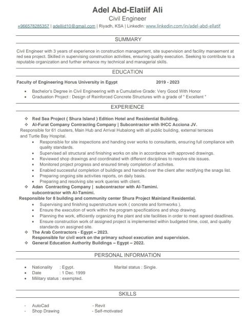 Civil Engineer looking for a new opportunity, I was working in Red Sea Project in Cnstructions and finishing works. Ready to start the work immediately