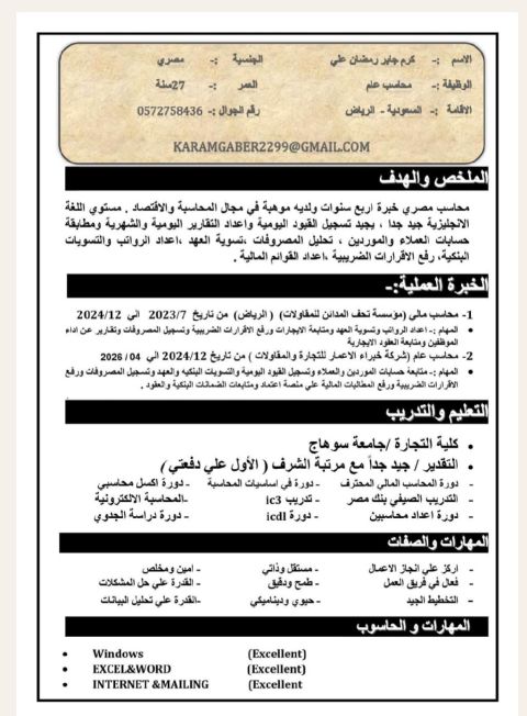 محاسب عام مصري خبرة أربع سنوات ولديه موهبة في مجال المحاسبة والاقتصاد. مستوى اللغة الانجليزية جيد جدا، يجيد تسجيل القيود اليومية واعداد التقارير اليومية والشهرية ومطابقة حسابات العملاء والموردين، تحليل المصروفات، تسوية العهد، اعداد الرواتب والتسويات البنكية، رفع الاقرارات الضريبية، اعداد القوائم المالية متواجد في الرياض إقامة سارية ومتاح نقل كفالة