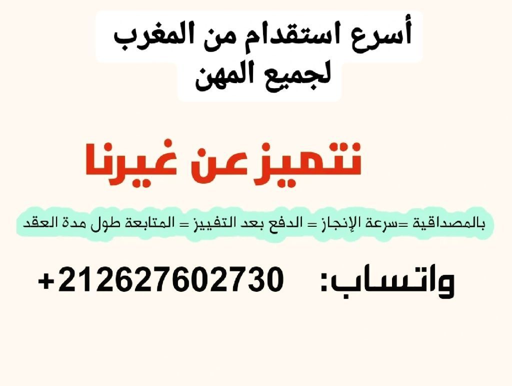 للاستقدام المباشر من المغرب نوفر لكم أفضل عاملات منازل وطباخات وعاملات لكبار السن ومربيات وممرضات منازل وسائقين بأقل التكاليف والدفع بعد التفييز من السفارة والوصول خلال فترة وجيزة والاختيار عن طريق مقابلة فيديو مباشر مع العمالة المناسبة للطلب. ضروري التوفر على سجل تجاري لاستخراج الفيزا على المغرب لأن التأشيرات الفردية متوقفة على الجنسية المغربية من أربع سنوات