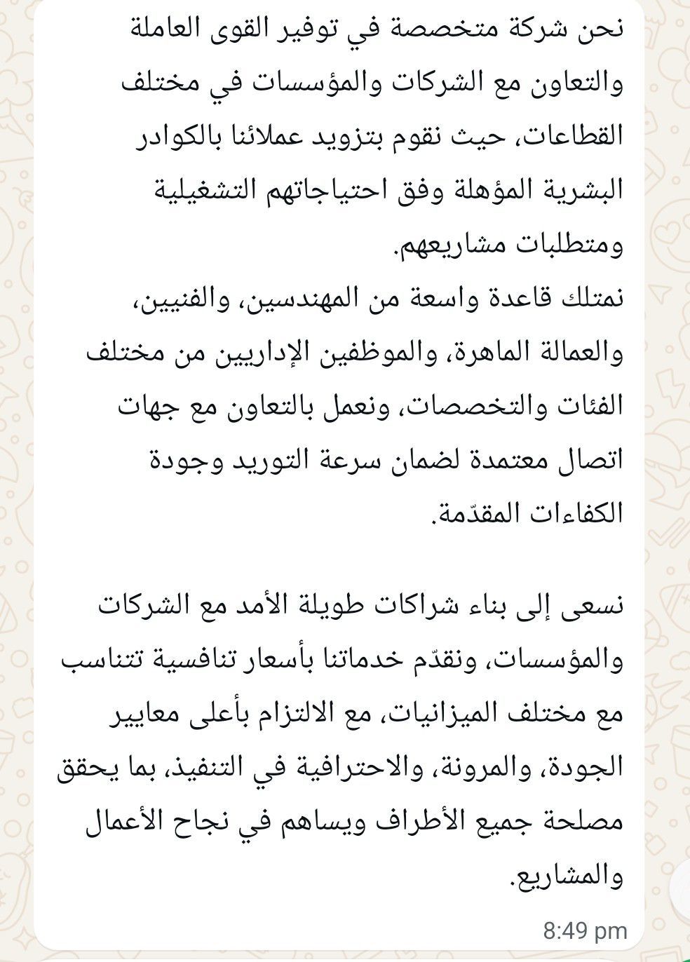 نحن شركة متخصصة في توفير القوى العاملة للشركات والمؤسسات في مختلف القطاعات، ونقدم مهندسين، فنيين، عمالة ماهرة، وموظفين اداريين حسب احتياجات مشاريعهم. نعمل في التعاون مع شركاء موثوقين لضمان سرعة التوريد وجودة الكفاءات، ونقدم خدماتنا بأسعار تنافسية مع الالتزام بأعلى معايير الجودة والاحترافية