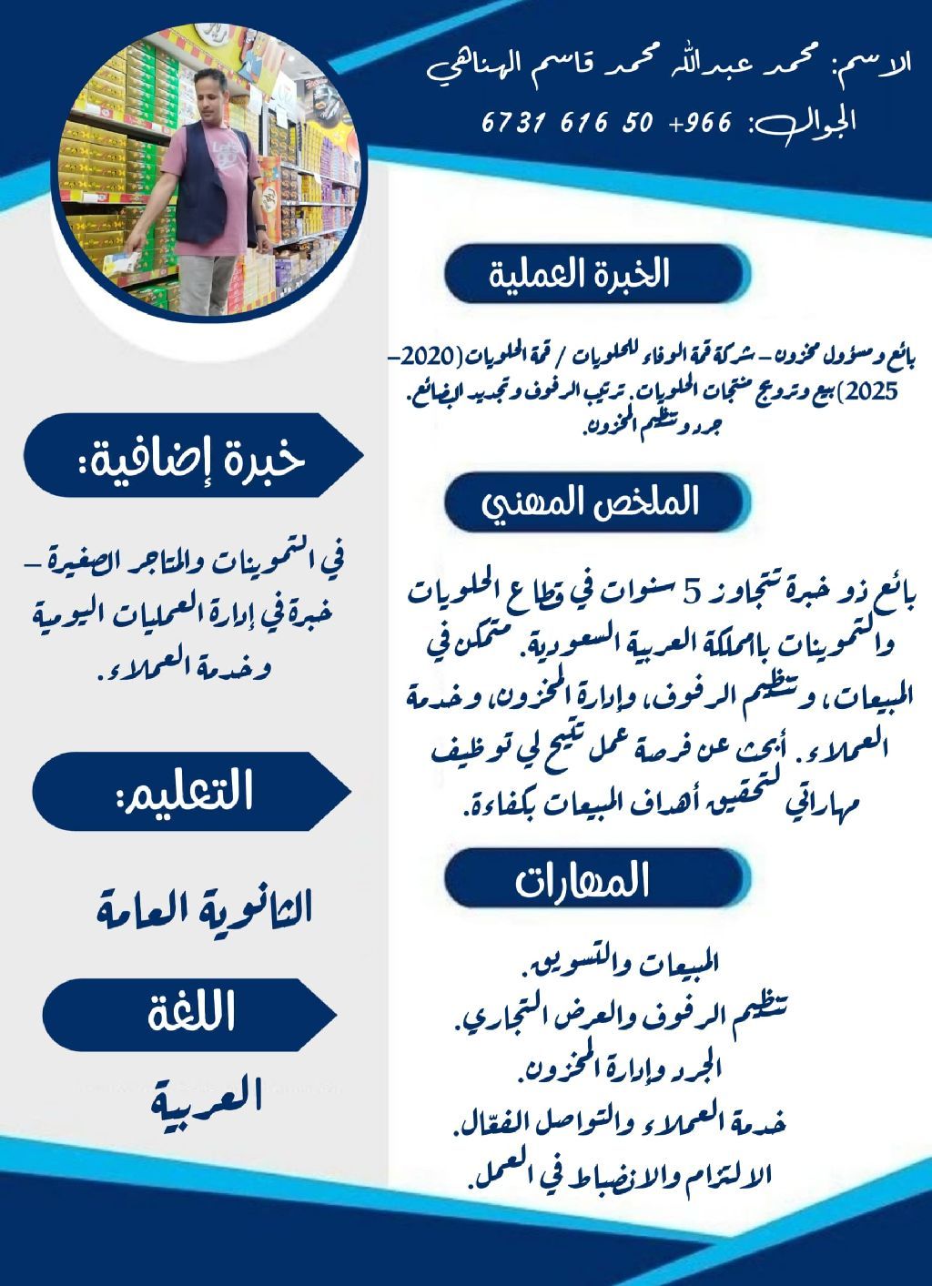 محمد عبد الله محمد قاسم ملخص الخبرات والمهارات أنا بائع بخبرة تزيد عن 5 سنوات في قطاع المبيعات والتموينات في المملكة العربية السعودية. ابحث عن فرصة عمل تمكنني من توظيف مهاراتي لتحقيق أهداف المبيعات بكفاءة والمساهمة في إدارة التموينات بفعالية. أبرز نقاط القوة خبرة عملية معمقة 5 سنوات في المبيعات. متخصص في التسويق ترتيب الرفوف، وعملت لدى شركة قمة الوفاء للحلويات