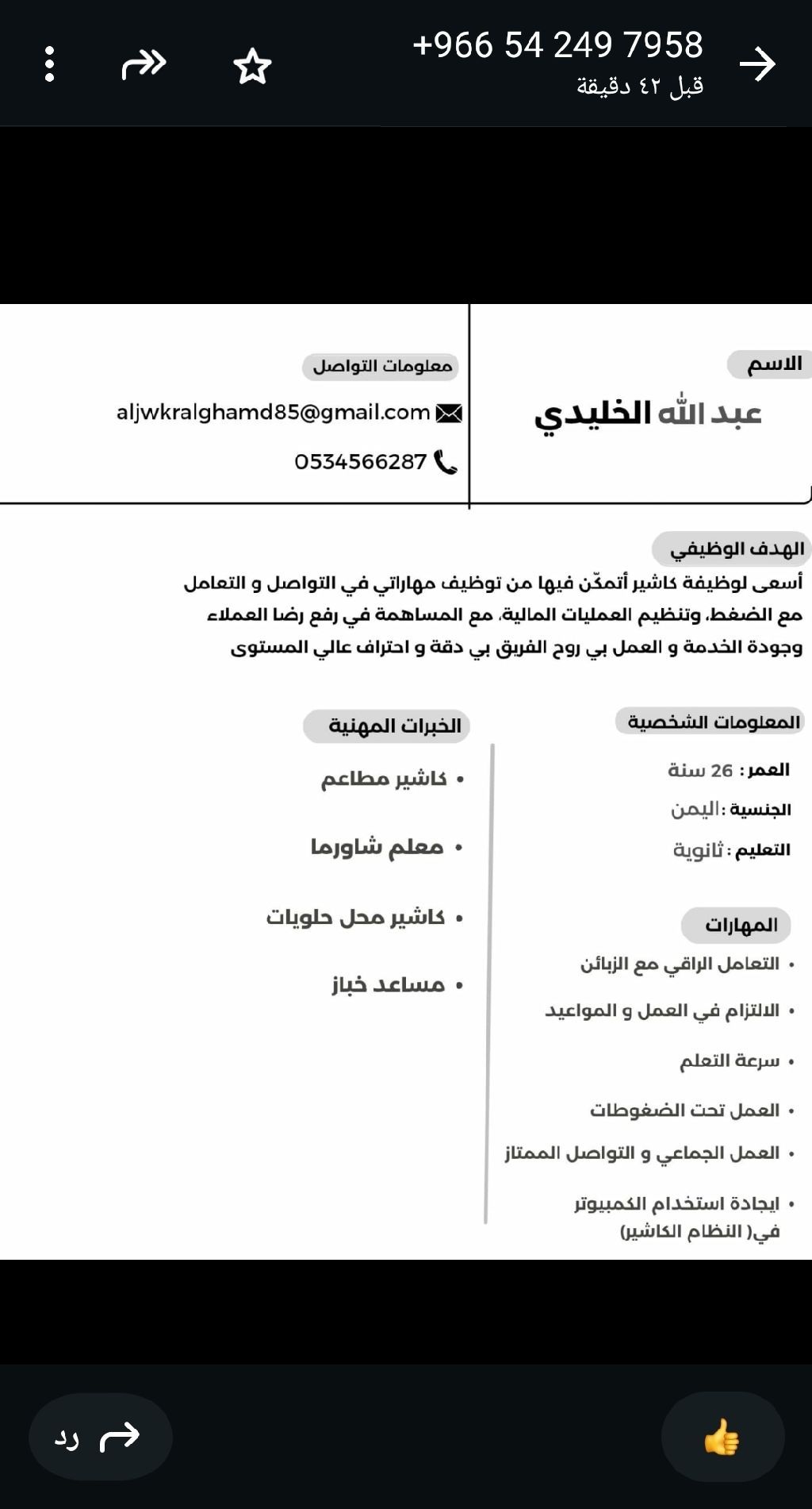 أنا شاب يمني العمر 26 سنة ابحث عن فرصة عمل في أي مجال مناسب، ولدي خبرة عملية في عدة وظائفا لخبرات كاشير ومعلم شاورما ومقطع كاشير ومبيعات حلويات مساعد خباز ملوح المهارات تعامل راق مع العملاء وأسلوب مقنع في التسويق ونظافة وشخصية وعملية وسرعة تعلم ممتازة وتحمل عالي لضغط العمل وتقديم اقتراحات تطور العمل مستعد للالتحاق بالعمل فورا