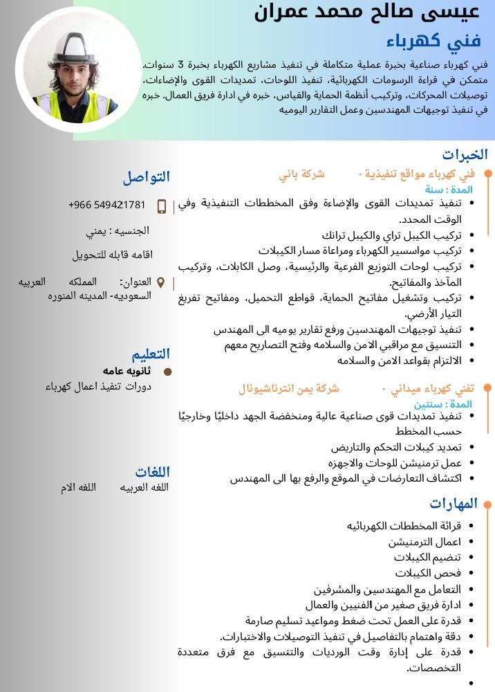 عيسى عمران من اليمن محافظة أب فني كهرباء رقمي في نصف الاعلان