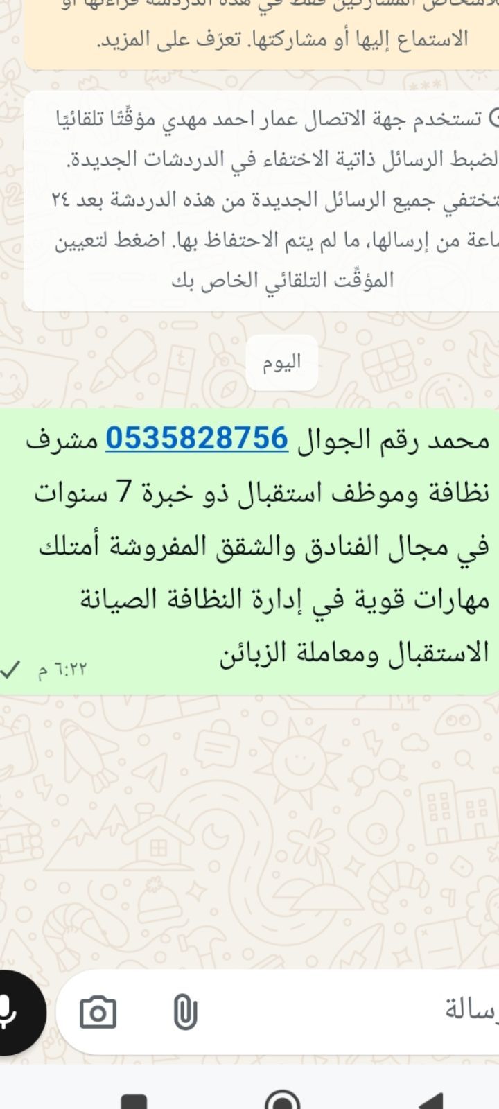 الاسم محمد ابحث عن عمل رقم الجوال 0535828756 رقم الثاني 0551067619 مشرف نظافة وموظف استقبال ذو خبرة 7 سنوات في مجال الفنادق والشقق المفروشة امتلك مهارات قوية في إدارة النظافة الصيانة الاستقبال ومعاملة البزبائن ابحث عن عمل أي شيء