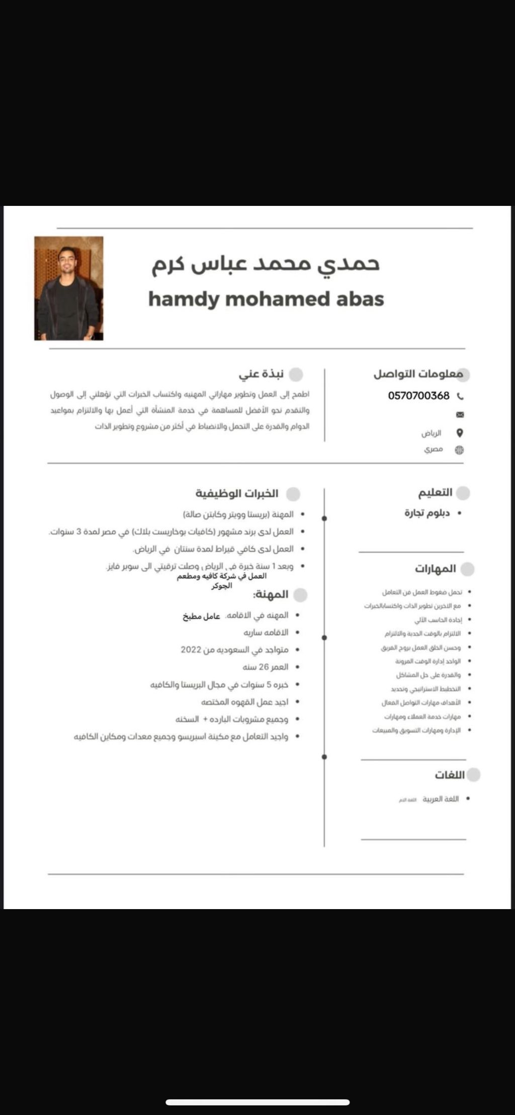 باريستا ابحث عن عمل خبرة 5 سنوات مصري العمر 26 سنة إقامة سارية المهنة في الإقامة عامل مطبخ